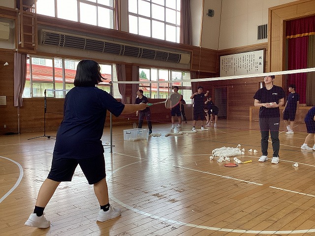 9月18日(木)北都銀行バドミントン部から3名の選手とコーチをお招きし、バドミントン教室を行いました。ウォーミングアップでは、コートの奥にシャトルを打ち込む練習や、コートの前に落とされるシャトルをフォアハンド・バックハンドを使い分けて返す練習を体験しました。練習後、選手の皆さんから普段の練習の様子や5点マッチの試合を見せてもらったり、ダブルスで選手と試合をしたりしました。生徒からは「シャトルの速さにびっくりした」「プロの選手と試合ができて嬉しかった」等の感想が聞かれました。