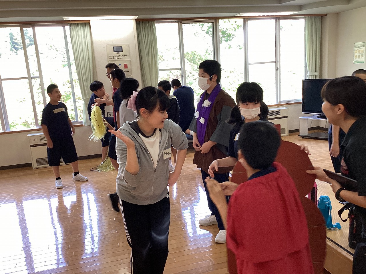 9月29日(月)に、秋山台祭に向けての発表練習をわらび座の方達と行いました。発声練習や、劇で行う予定のガンダーラのダンスや歌の練習をした後には、最後にする決めポーズの練習をしました。配置やポーズについて、わらび座の方からアドバイスを頂きながら、素敵なポーズを決めました。