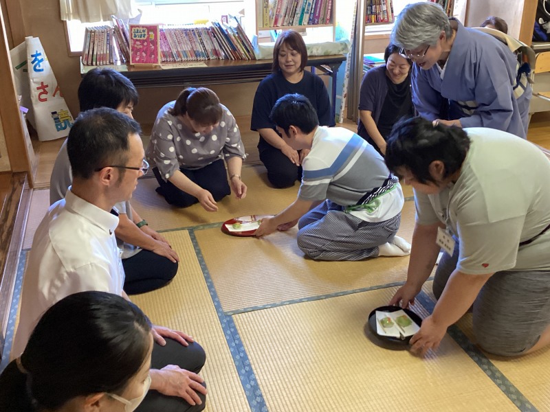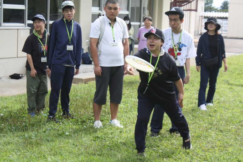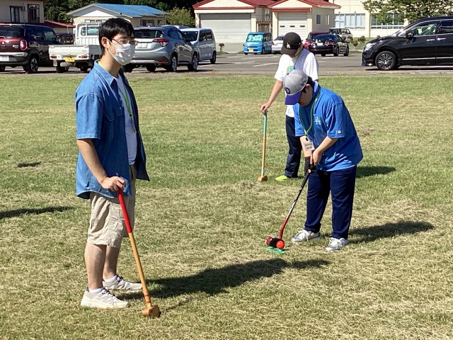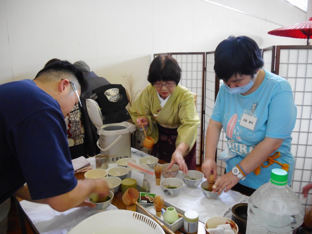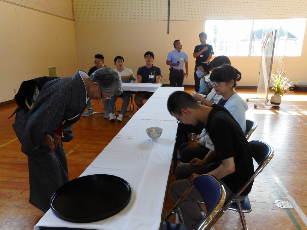 フライングディスクは、アキュラシーゴール、ビニール傘等を狙ってディスクを投げ、入ったり当たったりすると歓声が上がり、大いに盛り上がりました。グラウンドゴルフは暑い中でしたが、講師の方々と一緒にプレーし、お互いに「いいね!」「おしい!」などの声を掛け合いながら和気藹々と活動しました。茶道は、お茶の点て方や、茶室での振る舞い方など基本的なことを教えていただきました。昨年度も体験した人が多く、講師の先生に「よく覚えていましたね」と声を掛けられていました。