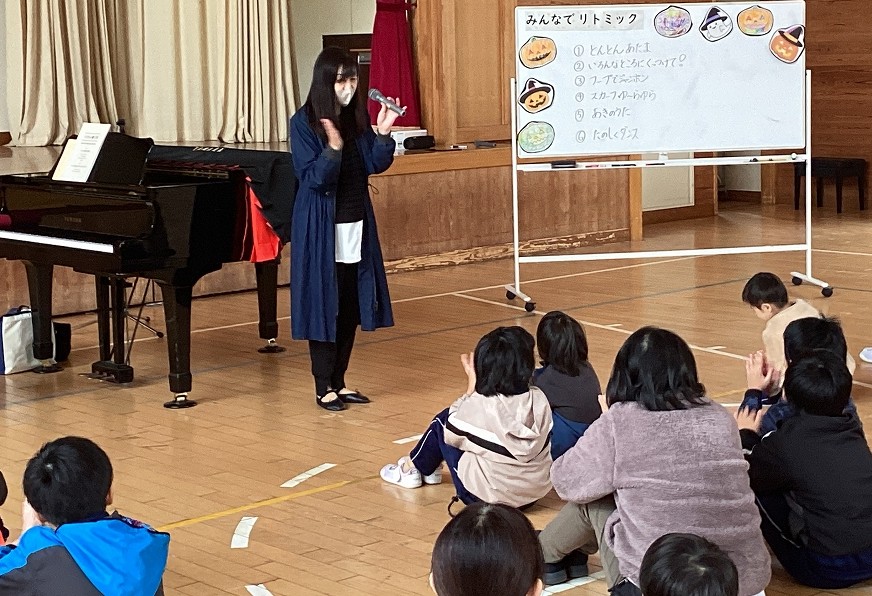 11月12日(水)「音楽にのって にこにこ わくわく」として、日本音楽療法学会認定音楽療法士の日沼郁子先生をお招きし、4・5・6年生を対象に音楽療法をしていただきました。
