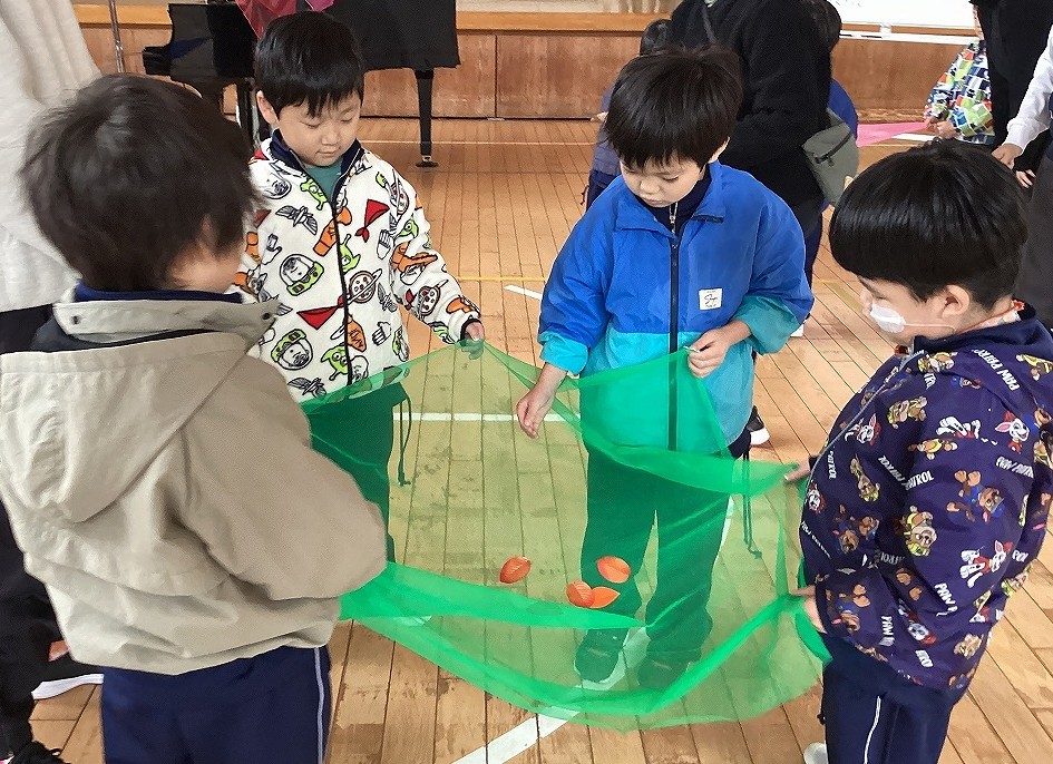 10月31日(金)森の音楽館の伊藤和美さんをお招きし、リトミック教室を開催しました。「いろんなところにくっつけて」「フープでジャンポン」では、伊藤さんの言葉やピアノの音をよく聞きながらボールやフラフープを使った動きを楽しみました。「スカーフゆ〜らゆら」では、大きなスカーフを4人で持ち、葉っぱを落とさないように友達と気持ちを一つにして楽しみました。