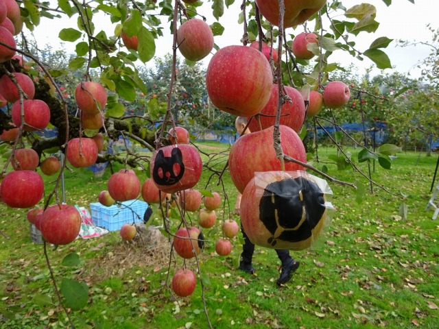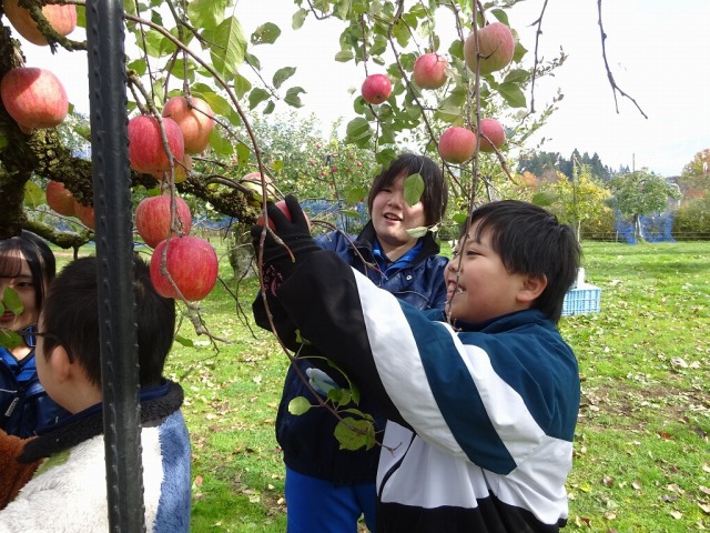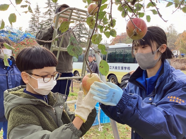 小学部5・6年生が、11月13日(木)に農業科学館で、大曲農業高校の8名の生徒と一緒にりんご狩りをしました。5・6年生が7月にデザインしたりんごの模様(イラスト)を、農業科学館の方がシールにし、大曲農業高校生が9月10日、りんごにシールを貼ってくれました。自分たちがデザインしたイラストが模様になったりんごを、大曲農業高校生と一緒に楽しく狩ることができました。