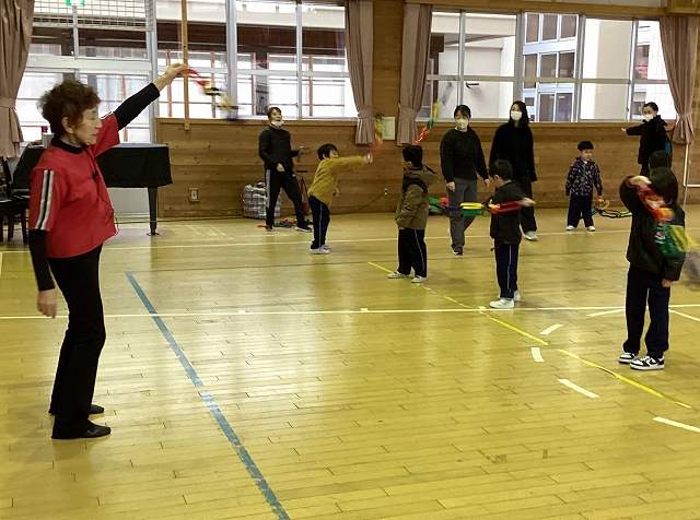 11月6日(木)日本3B体操協会の渡部けい子さんをお招きし、3B体操教室を行いました。3B体操の3つの用具「ベルター」では、ヘリコプターのように回す、上に投げてキャッチする、「ボール」では、腰に付けて左右にひねる、足の上を転がす、「ベル」では、手を通して回す、つま先に引っかけて足を伸ばすなどの様々な動きを楽しみました。最後の3つの用具を使ったサーキット運動では、動きの組み合わせの楽しさを感じながら笑顔で体を動かす様子が