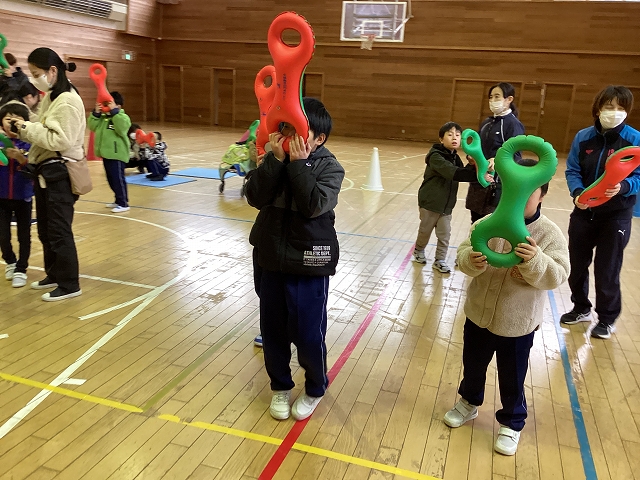 11月21日(金)日本3B体操協会の渡部けい子さんをお招きし、3B体操教室を行いました。3B体操の3つの用具「ベルター」では、ヘリコプターのように回す、頭から足まで通す、「ボール」では、足の左右にくっつけて足の上を転がす、「ベル」では、両手で持ってハンドルのように左右に動かすなどの様々な動きを楽しみました。最後の「ベル」をひっくり返して自分のチームの色に変えるオセロゲームでは、みんな大喜びで楽しさを感じながらたくさん体を動かす様子が見られました。