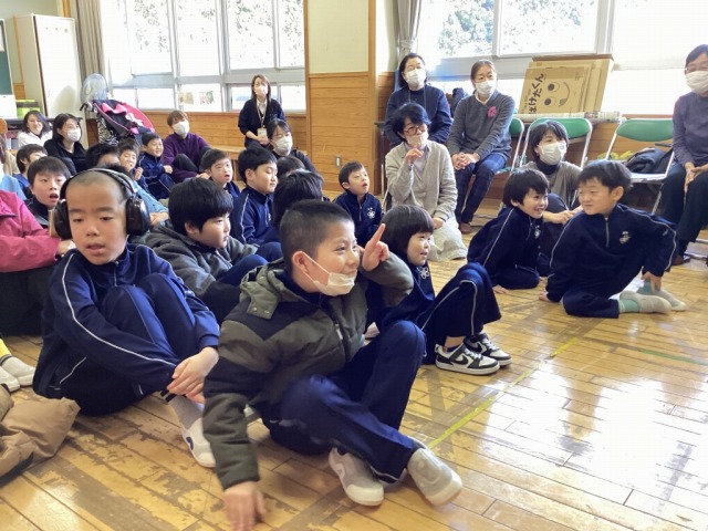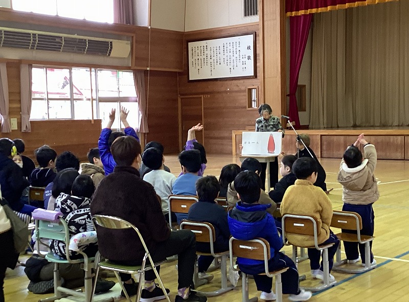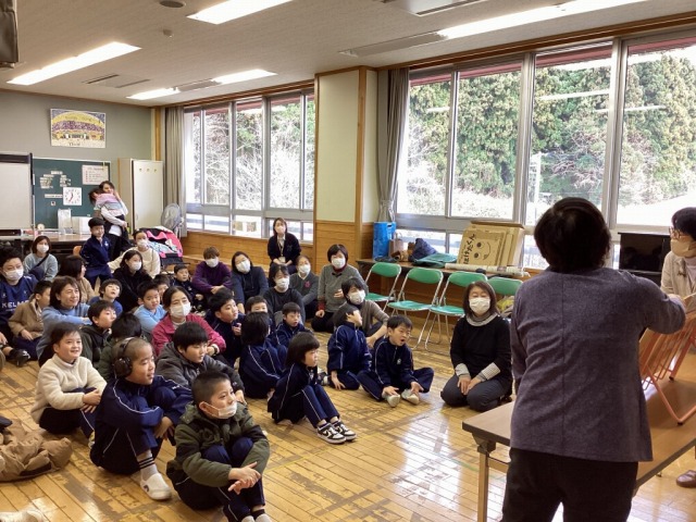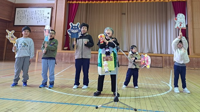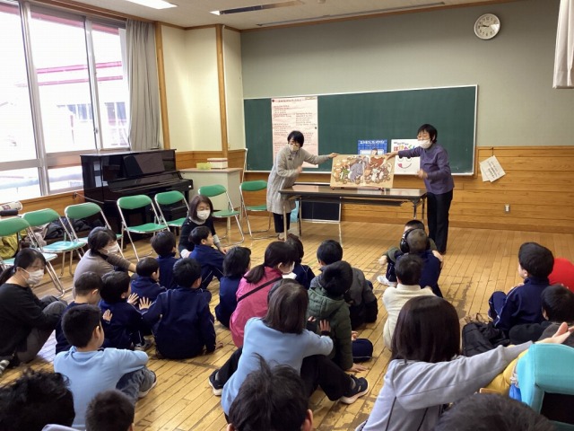 12月1日(月)、今野順子さんと8名のお話ボランティア「そよかぜ」の皆さんをお迎えし、読み聞かせの会を開催しました。大型絵本、パネルシアター、クリスマスソングと様々な読み聞かせや音楽を披露していただき、みんなで読み聞かせに合わせて体を動かしたり、「そよかぜ」のみなさんからの問いかけに応えたりしながら楽しみました。パネルシアターの「たべちゃった」では、動物たちが星を食べてしまう場面に期待感いっぱいの表情でパネルに釘付けになっていました。最後には児童みんなが自然と「そよかぜ」のみなさんとハイタッチをしたり「『ばけたくん』が楽しかったです」と感想を伝えたりして交流する場面も見られました。