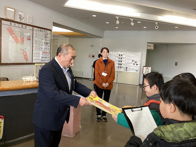 事前学習ではカレンダーを渡すときの話し方や渡し方を練習し、当日は明るい表情で手渡すことができました。受け取っていただいた皆様から「いつもありがとうございます。パッケージを開けるのが楽しみです」「今年もすてきですね」などと感想を話していただき、とてもうれしい気持ちになりました。