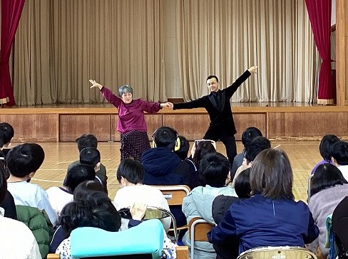 12月15日(月)読み聞かせ、歌唱、楽器演奏をしてくださるボランティアの方々をお迎えし「おはなしコンサート」を開催しました。今回は、大曲ダンスアカデミーの阿部和樹先生がゲストで来校し、クリスマスメドレーで社交ダンスを披露してくださいました。初めて見る社交ダンスに子どもたちの目はくぎづけになりました。また、大型絵本の楽しいお話やクラリネットの音色、クリスマスソングの歌声に引きこまれ、あっという間に時間が過ぎていきました。最後の「ジングルベル」では、ピアノとクラリネットの演奏、社交ダンス、全員の歌声が一つになり、会場はクリスマスの雰囲気になりました。